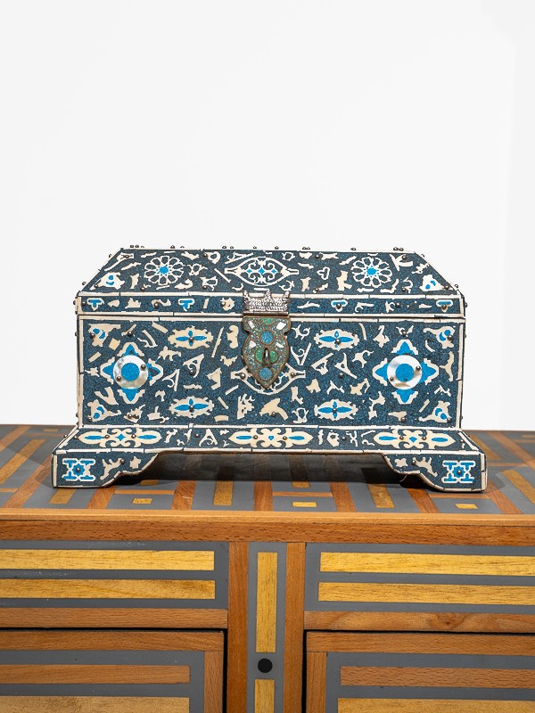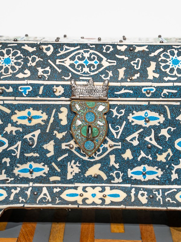 Bathed in hues of celestial blue, the chest features bone inlays arranged in mesmerizing patterns, bordered by ornate metallic details, evoking the majestic artistry of ancient Moroccan dynasties.