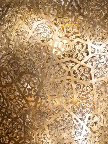 The lamp's detailed filigree pattern allows light to filter through, creating a warm and inviting ambiance while casting beautiful shadows.