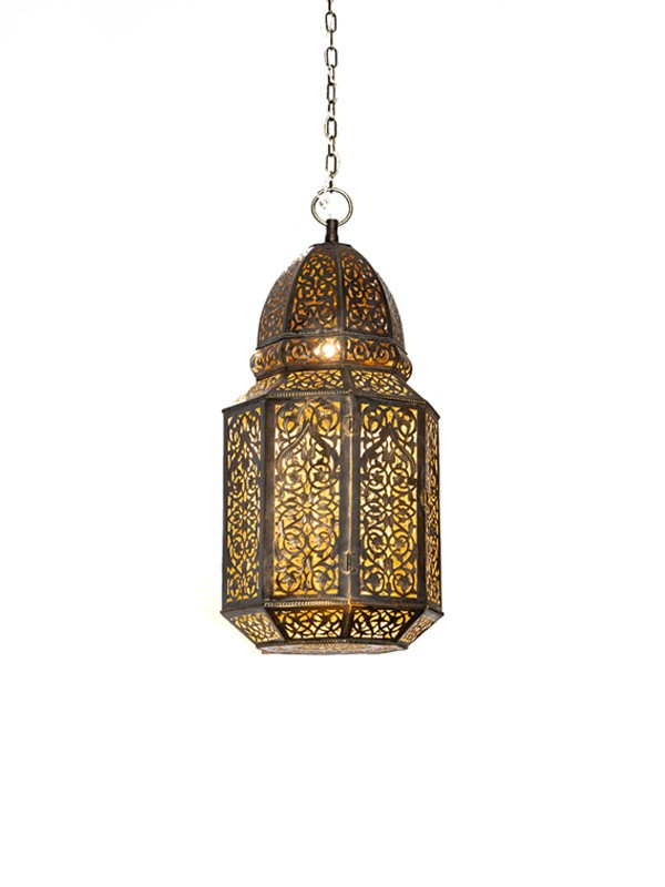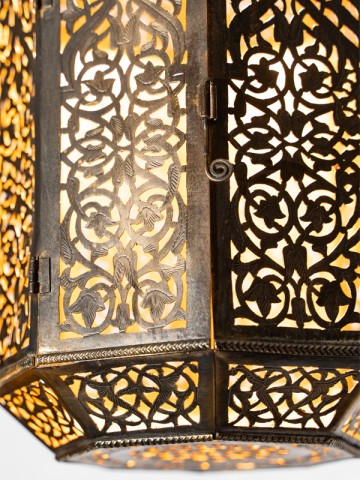 The Zara Lantern features a classic Moroccan design with intricate brass patterns, bringing a touch of elegance and cultural richness to any space.