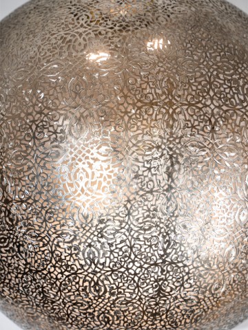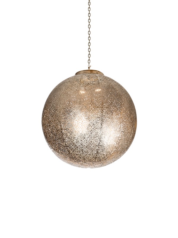 The Luna Hanging Lamp features a classic globe shape, crafted from white copper with intricate perforations that create beautiful light patterns, adding a touch of elegance to any room.