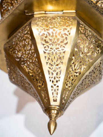 The Celeste Hanging Lantern showcases a classic Moroccan design with intricate brass patterns, adding an elegant touch to any decor.