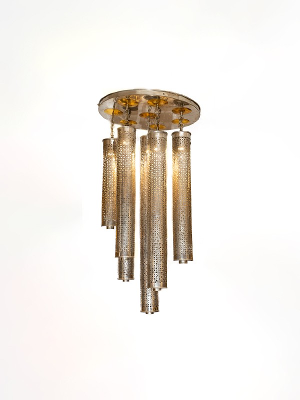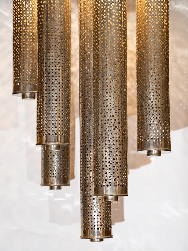 The lamp's perforated copper design allows light to filter through, creating a warm and inviting atmosphere while casting beautiful shadows.
