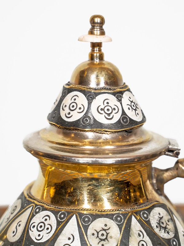This brass teapot is a testament to the enduring art of Moroccan metalwork. Artisans have meticulously shaped and hammered the brass to create a piece that is both functional and ornamental.
