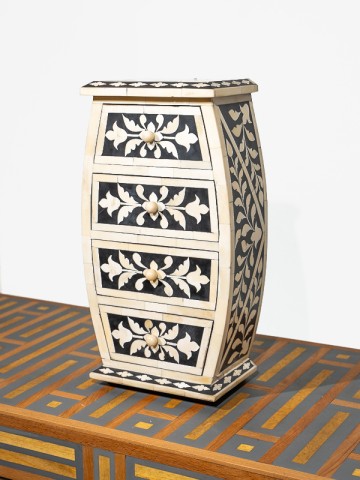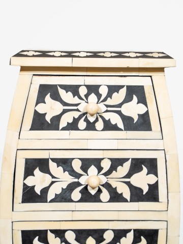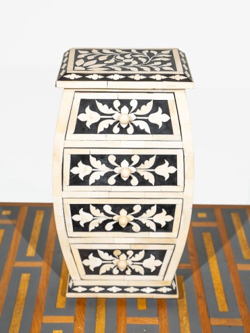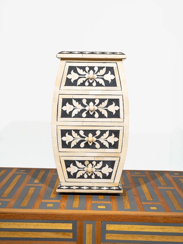 Each drawer features a handcrafted design, consistent with the heritage of Moroccan artisanship. The subtle hues of the bone against the resin backdrop offer a contemporary twist to a classic motif, promising to suit a range of interior palettes.