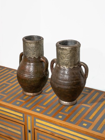 This jar exemplifies the artistry of Moroccan craftsmanship, marrying robust ceramic with ornate brass detailing. It's an artifact that resonates with history while perfectly fitting modern aesthetics.