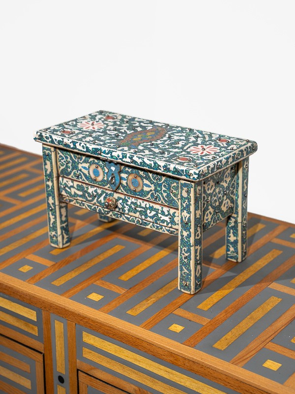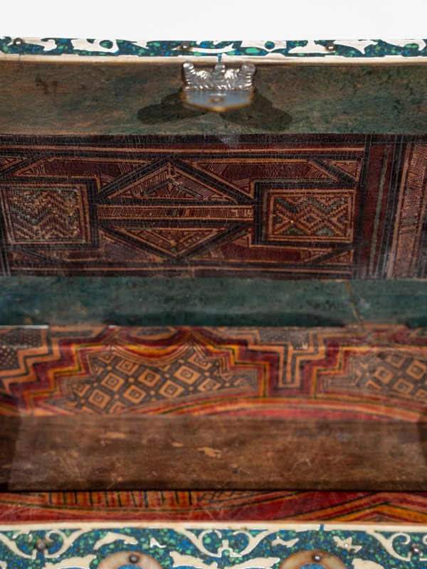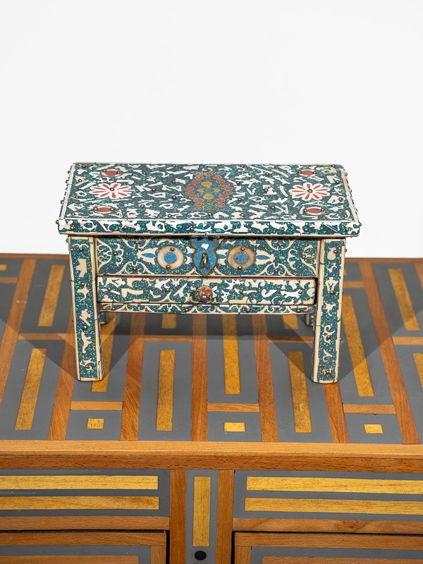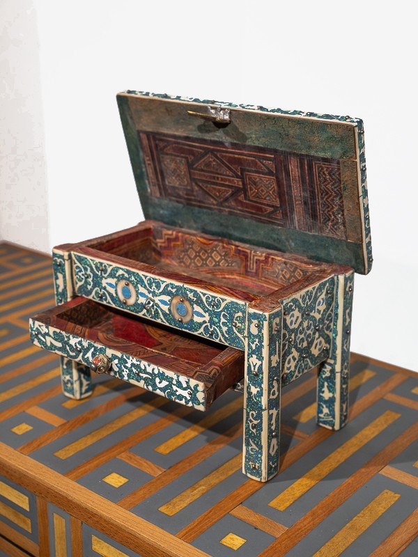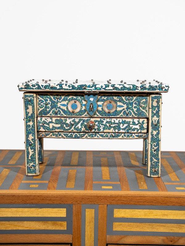 El cofre es un lienzo de artesanías marroquíes, donde hábiles artesanos han colocado con intrincación cada pieza de turquesa entre diseños de filigrana, creando un objeto de deseo que Scheherazade misma atesoraría.