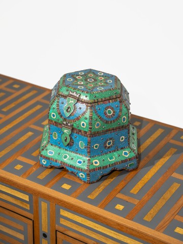 Este tesoro octogonal, elaborado por las hábiles manos de los artesanos del Palacio de Marrakech, se erige como un monumento en miniatura de la grandiosa tradición marroquí de incrustaciones de latón y hueso.