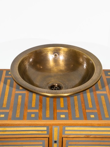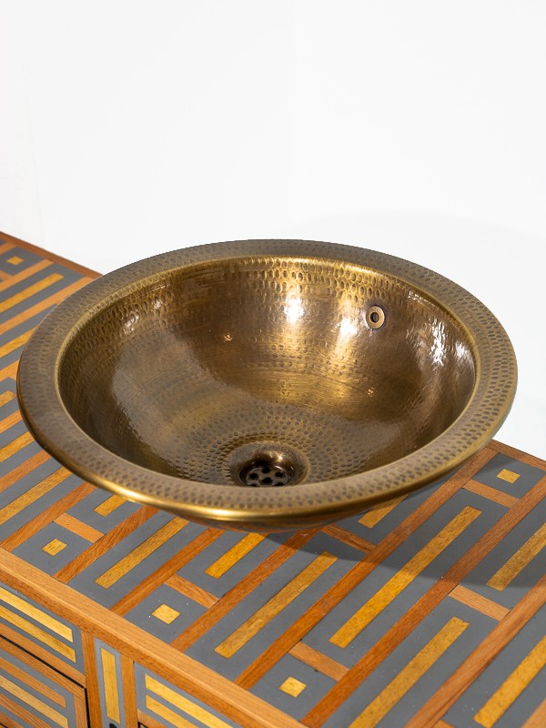 Abraza la belleza de la artesanía artesanal con este lavabo de latón. Cada lavabo está martillado a mano, creando una superficie que juega con la luz y la sombra, ofreciendo un atractivo estético único.