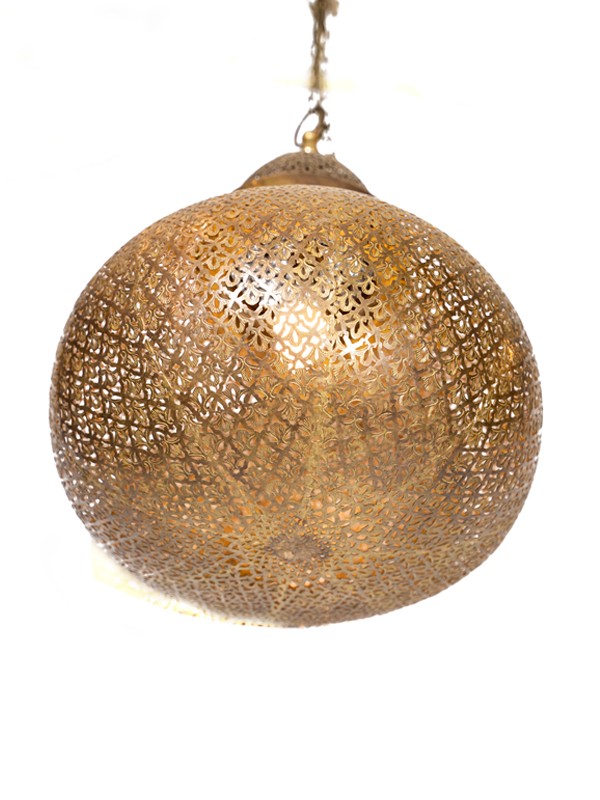 La lámpara colgante Elena presenta un diseño esférico con perforaciones intrincadas en toda su superficie de latón, ofreciendo una combinación de artesanía marroquí tradicional y detalles artísticos.