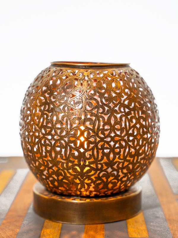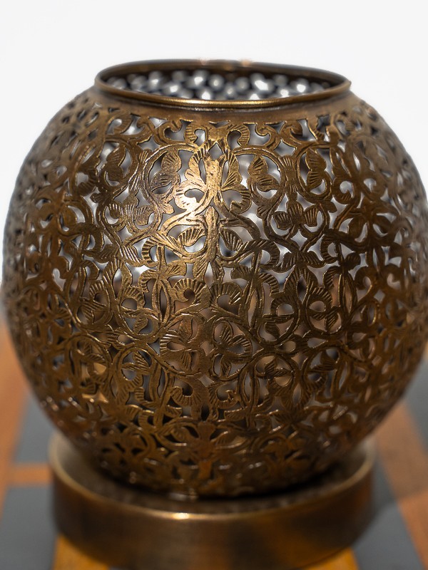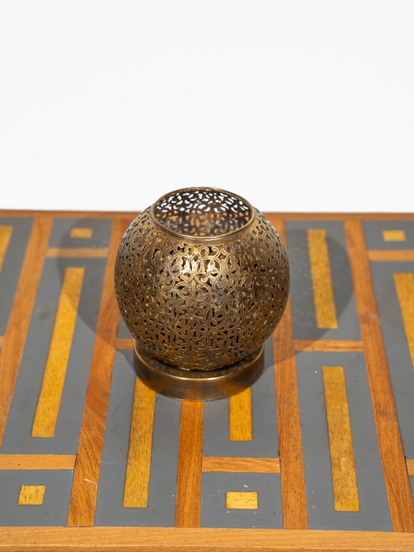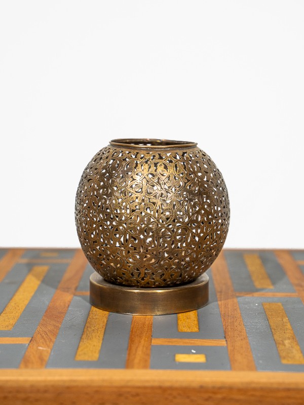 Este jarrón de latón en forma de globo del Palacio de Marrakech es un testimonio de la tradición atemporal de la artesanía marroquí, con un elaborado diseño de filigrana que irradia calidez y lujo.