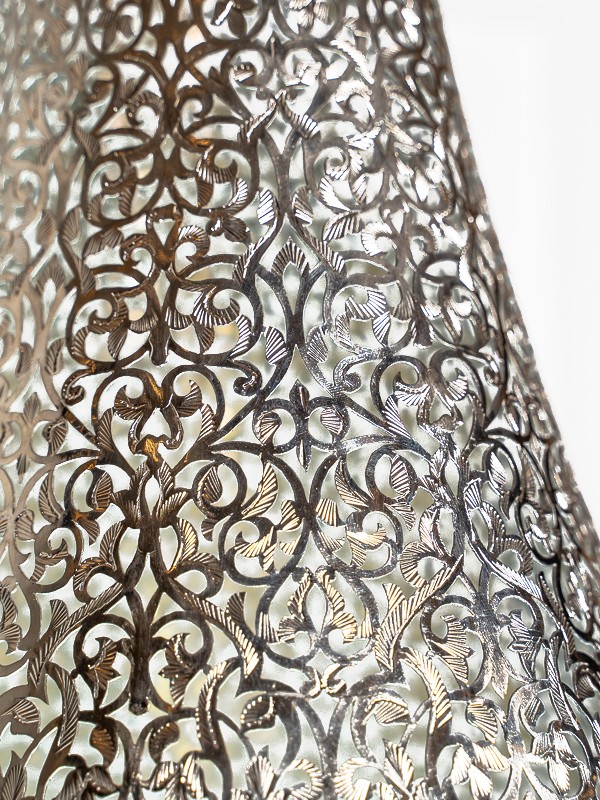 Esta linterna de peltre hecha a mano de Marrakech Palace es una encarnación del patrimonio cultural y la habilidad artesanal. Su diseño está inspirado en el arte tradicional marroquí, ofreciendo no solo luz sino también una atmósfera de elegancia histórica.