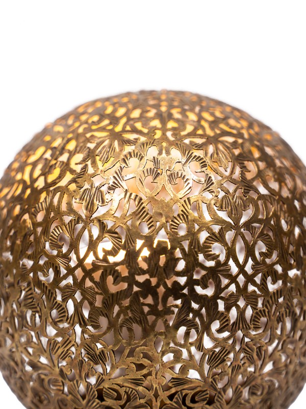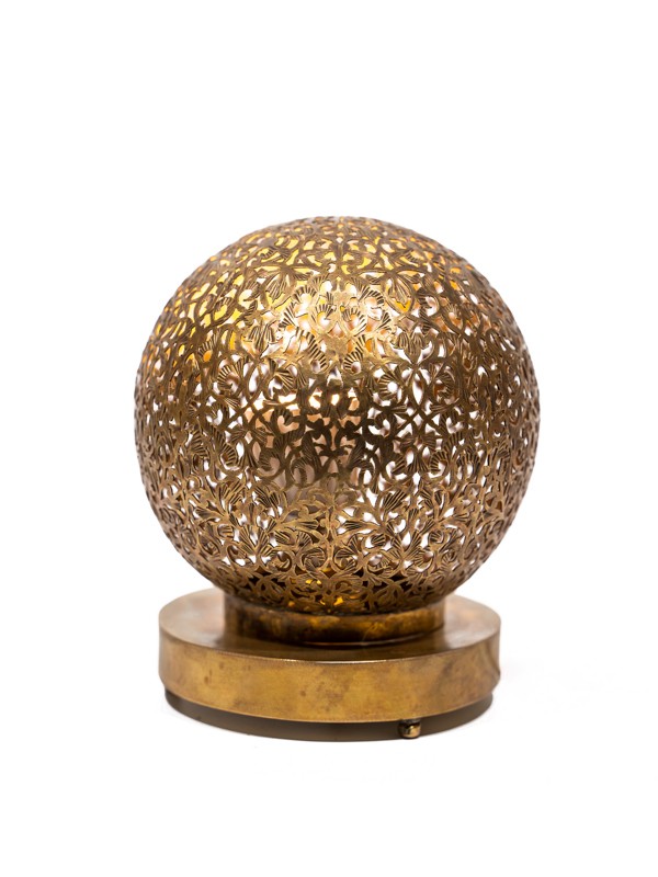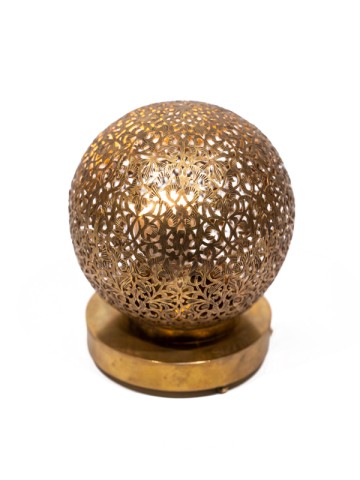 La lámpara de mesa de latón radiante es una celebración de la fina artesanía marroquí, presentada por el Palacio de Marrakech. Su silueta esférica y los recortes con patrones crean una atmósfera íntima con patrones de luz cautivadores.