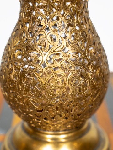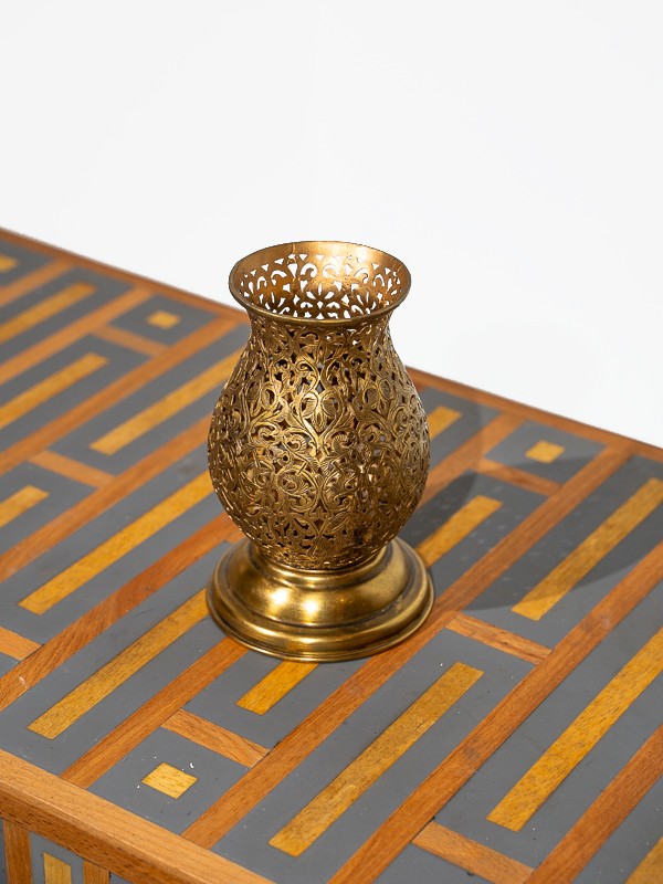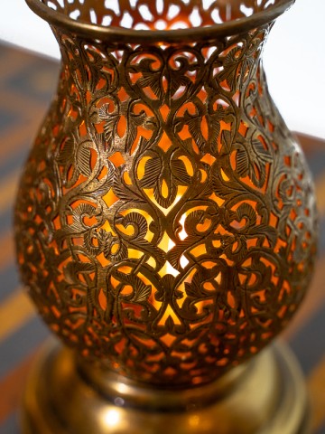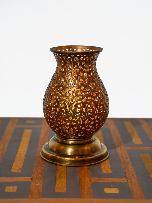 Este portador de latón encarna la exquisita artesanía de los artesanos del Palacio de Marrakech. Tallado a mano con precisión, su diseño de celosía no es solo intrincado, es un pedazo de historia moldeado por manos que conocen el alma del trabajo en metal.