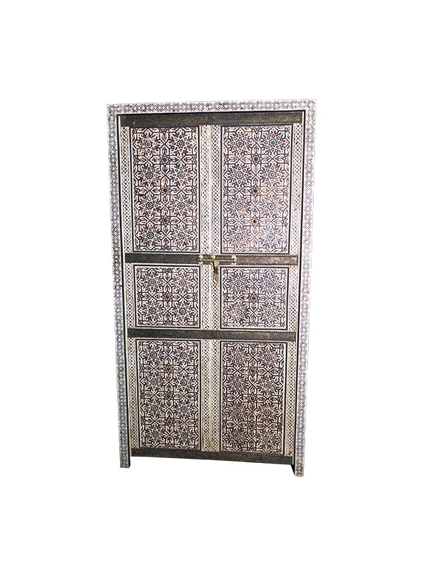 La porte Silwane présente un design exquis en incrustation d'os, parfait pour ajouter une touche de grande élégance marocaine à tout espace.