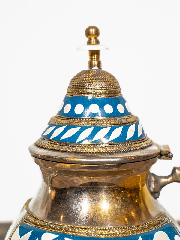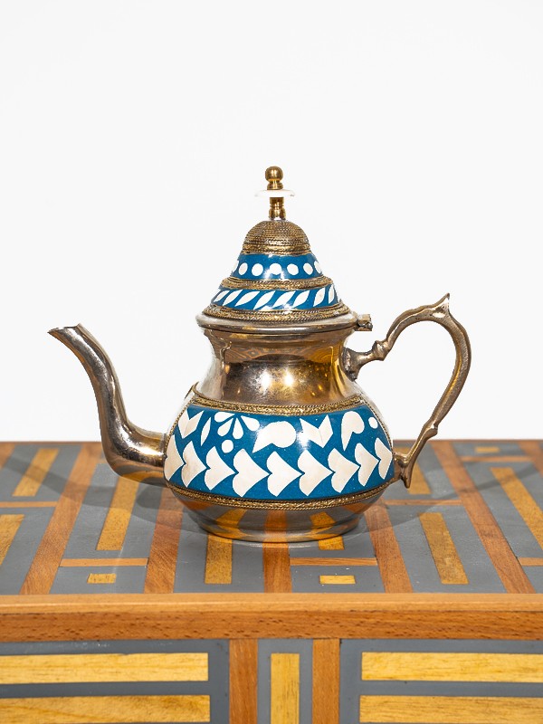 Cette théière en laiton est un chef-d'œuvre, avec un travail d'incrustation d'os complexe qui reflète le riche patrimoine marocain. Chaque théière est un témoignage des compétences méticuleuses des artisans locaux, chaque détail étant fini à la perfection à la main.
