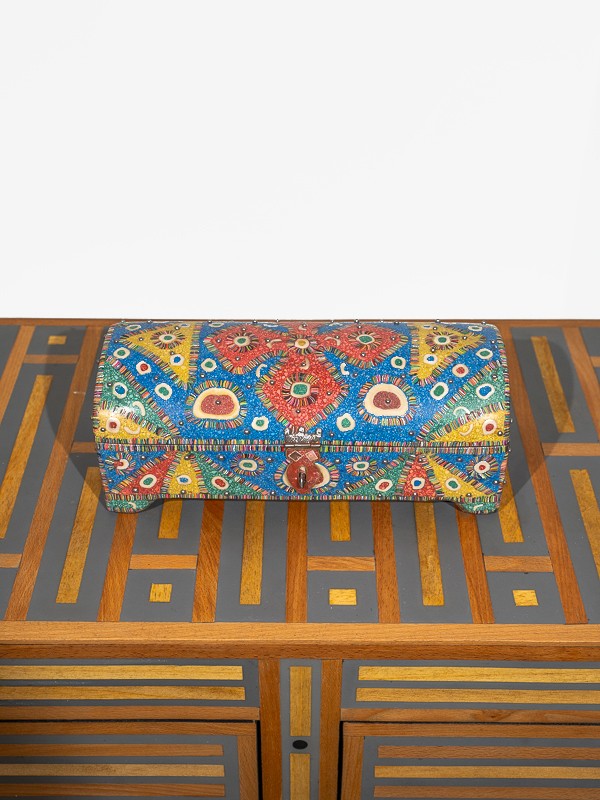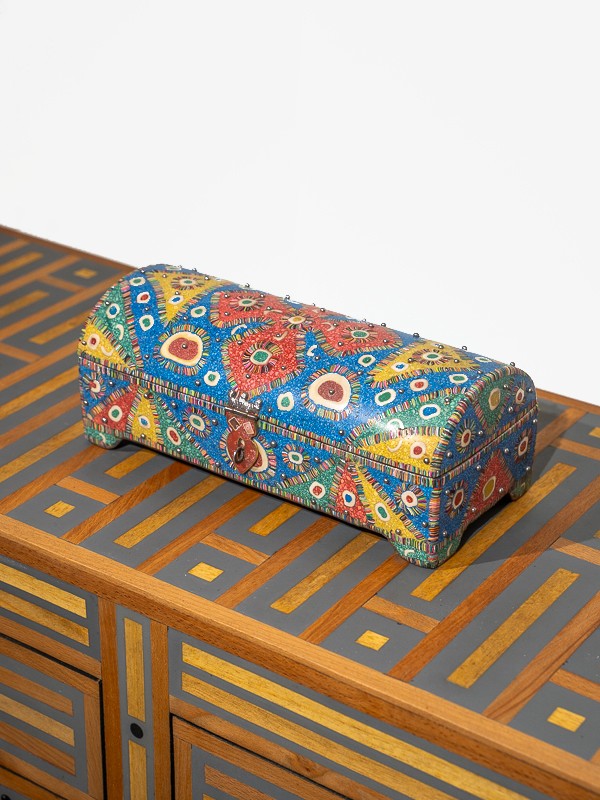 Le design orné et les accents de bijoux du coffre en font un centre magnétique, non seulement une solution de rangement mais un artefact narratif qui éblouit par sa palette de couleurs et de textures.