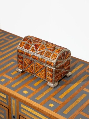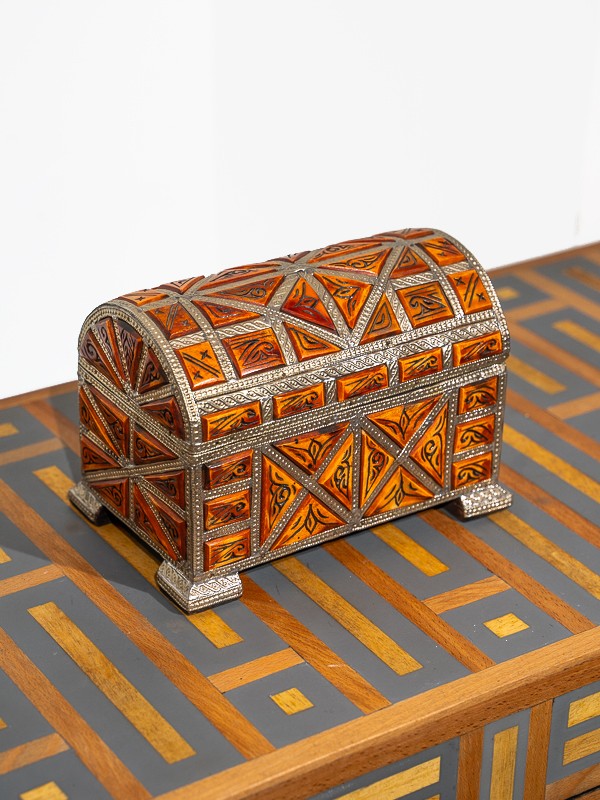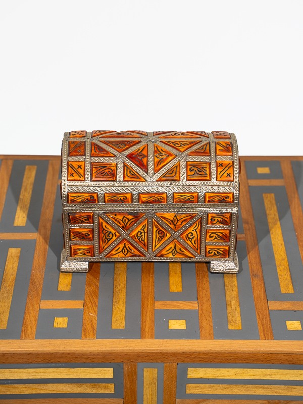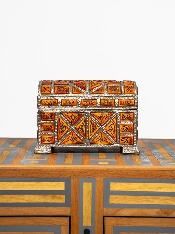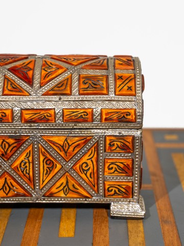 Plongez au cœur de la tradition marocaine avec le coffre au trésor Ember, une œuvre d'art mettant en valeur une incrustation tribale qui évoque des images des anciens symboles berbères, rehaussée par la brillance de la filigrane en argent.