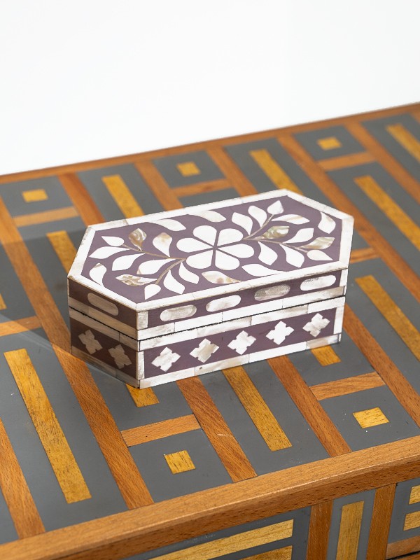 Dans l'esprit du patrimoine marocain, cette boîte à bibelots est une symphonie de contrastes, avec les teintes crémeuses de l'os incrusté dans une résine sombre, chaque pièce étant posée avec une attention méticuleuse aux détails.