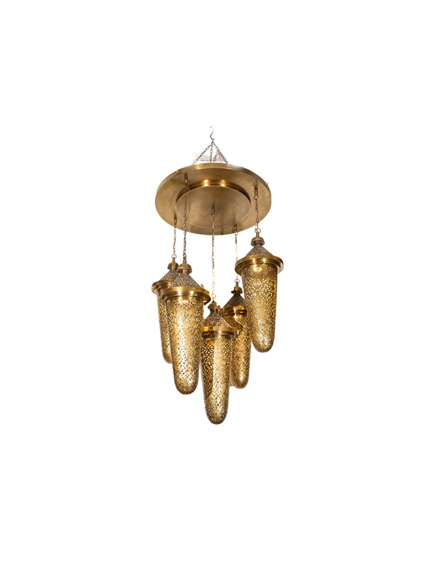 La lampe Fiona présente un ensemble de pendentifs en laiton, chacun suspendu à des hauteurs différentes, créant un effet visuel dynamique et un point focal dans n'importe quelle pièce.
