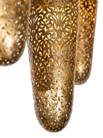 Chaque pendentif est délicatement perforé pour permettre à la lumière de s'échapper en motifs uniques, projetant de belles ombres et ajoutant à l'ambiance de l'espace.