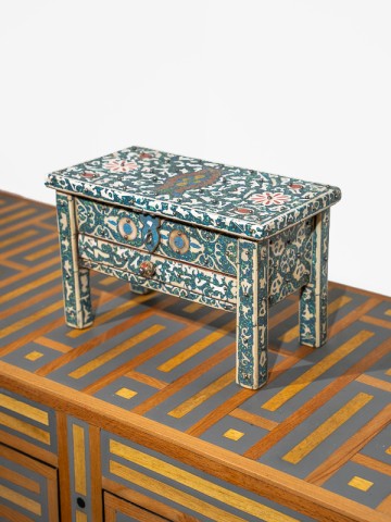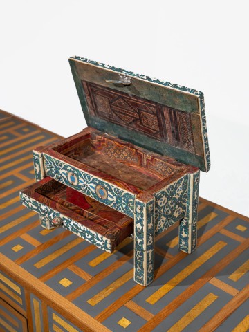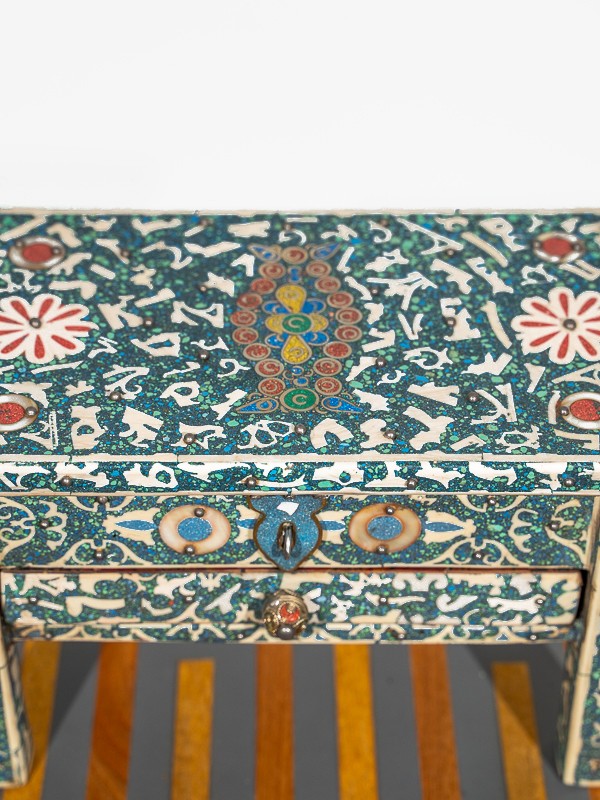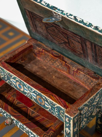 O baú é um quadro das artes marroquinas, onde artesãos habilidosos colocaram com intrincadeza cada pedaço de turquesa entre desenhos de filigrana, criando um objeto de desejo que Scheherazade mesma apreciaria.