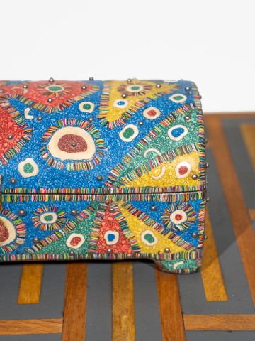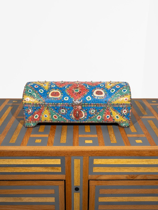 O design ornamentado e os acentos de joalharia do baú tornam-no um centro magnético, não apenas uma solução de armazenamento, mas um artefato narrativo que deslumbra com sua variedade de cores e texturas.