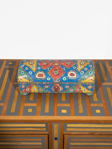 Adornado com um cativante mosaico de esmalte e cravejado com pedras semipreciosas, cada detalhe deste baú é um testemunho da habilidade dos artesãos, evocando os luxuosos contos das "1001 Noites".