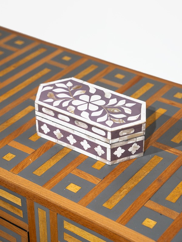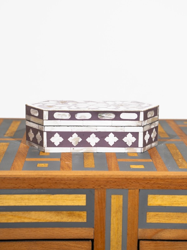 No espírito da herança marroquina, esta caixa de bugigangas é uma sinfonia de contrastes, com os tons cremosos de incrustações de osso em uma resina escura, cada peça colocada com atenção meticulosa aos detalhes.
