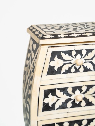 Cada gaveta apresenta um design artesanal, consistente com a herança da arte marroquina. As sutis tonalidades do osso contra o fundo de resina oferecem um toque contemporâneo a um motivo clássico, prometendo se adequar a uma variedade de paletas de interiores.