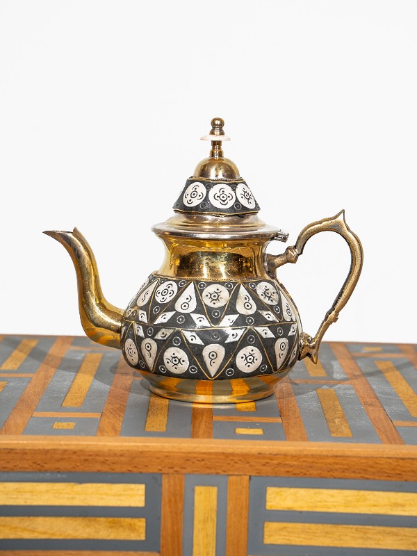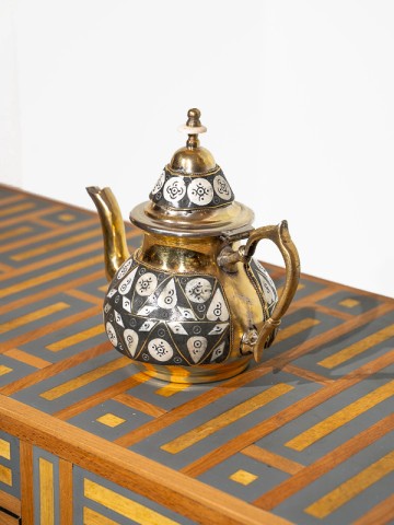 Esta chaleira de latão é um testemunho da arte duradoura da metalurgia marroquina. Os artesãos moldaram e martelaram meticulosamente o latão para criar uma peça que é tanto funcional quanto ornamental.