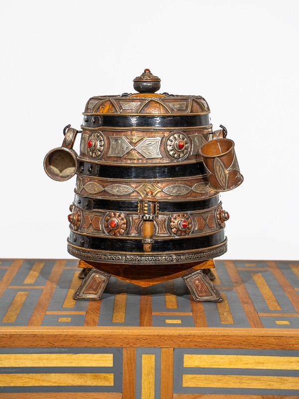 O dispensador continua sendo uma peça prática para uso com um registro funcional, ao mesmo tempo em que serve como ponto de partida para conversas. As xícaras emparelhadas oferecem uma experiência completa da vida diária passada.