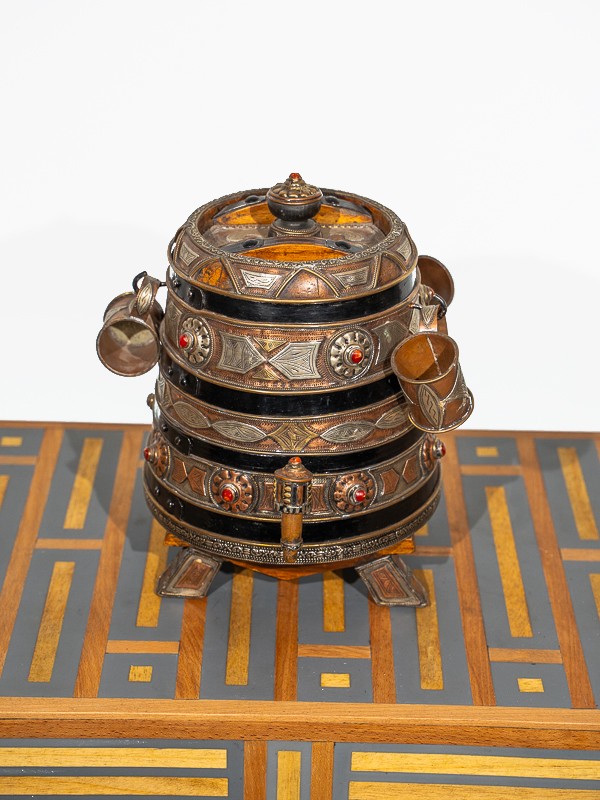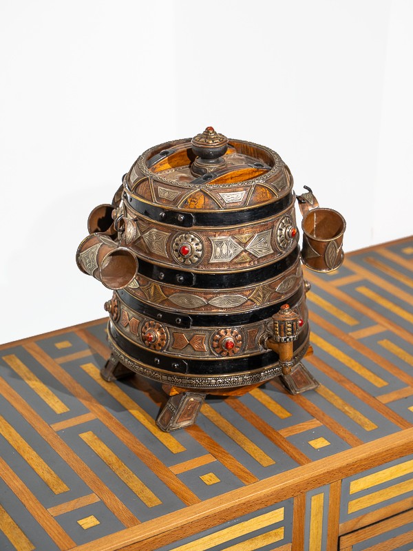 Encerrado em uma estrutura robusta de madeira de cedro, realçado com detalhes ornamentais de latão e cobre, este dispensador é um testemunho da meticulosa arte de seu era original.