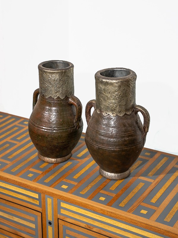 Este frasco exemplifica a arte da artesanato marroquina, combinando cerâmica robusta com detalhes de latão ornamentado. É um artefato que ressoa com a história ao mesmo tempo em que se adapta perfeitamente às estéticas modernas.