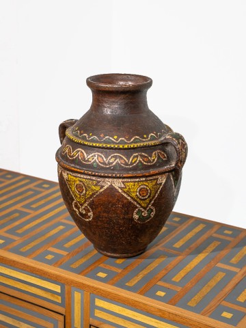Este jarro de cerâmica, com sua forma robusta e acabamento em tons terrosos, traz a simplicidade e o calor da artesanía rural para sua casa. Ideal para aqueles que apreciam a beleza da cerâmica artesanal.