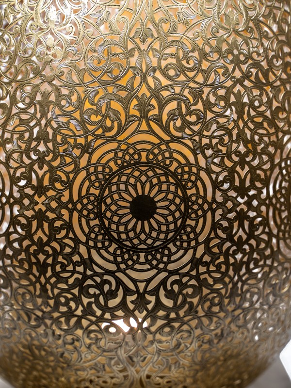 Os artesãos perfuram habilmente o latão, criando padrões intrincados que permitem que a luz escape em um brilho suave e ambiente. Cada lâmpada é um farol da arte.