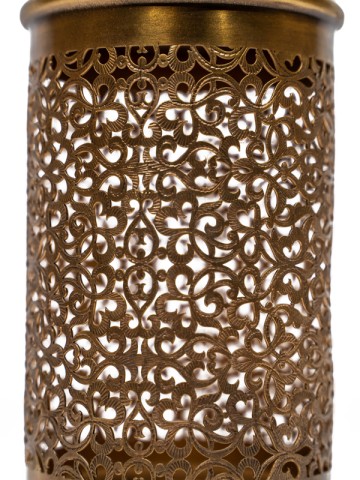 O trabalho de filigrana intricado na tela de latão projeta uma dança fascinante de luz e sombra, criando uma atmosfera serena perfeita para relaxamento ou hospitalidade.