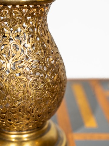 Este suporte de latão incorpora a exímia habilidade dos artesãos do Palácio de Marrakech. Entalhado à mão com precisão, seu design em treliça não é apenas intrincado, é um pedaço de história moldado por mãos que conhecem a alma do trabalho em metal.